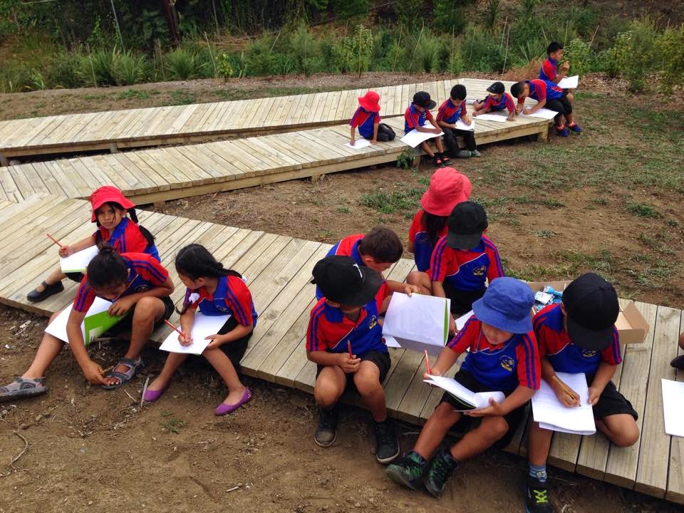 At a hot hot day we drink our milk. I was doing Tuhituhi and sketching the fence at the living classroom. Then we lined up to go back to class.